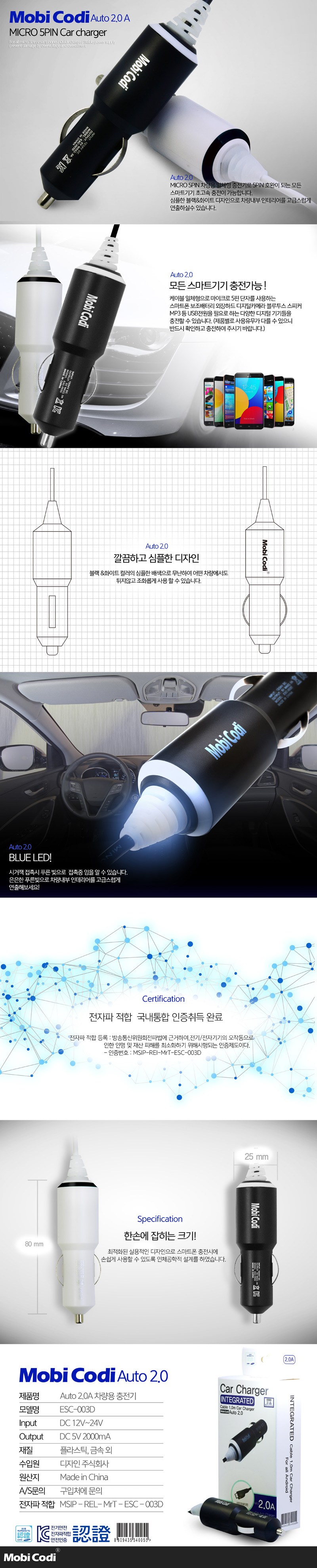 모비코디 Auto 2.0 마이크로 5핀 일체형 차량용 충전기 (2A)