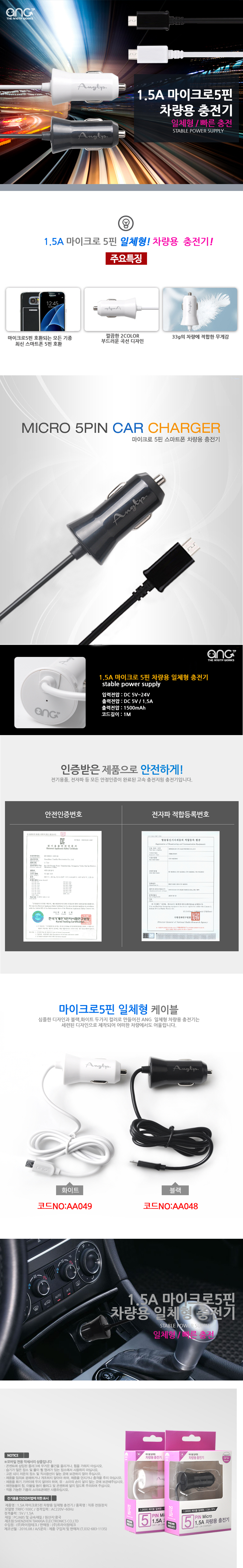 앙티피 마이크로 5핀 일체형 차량용 충전기 (1.5A)