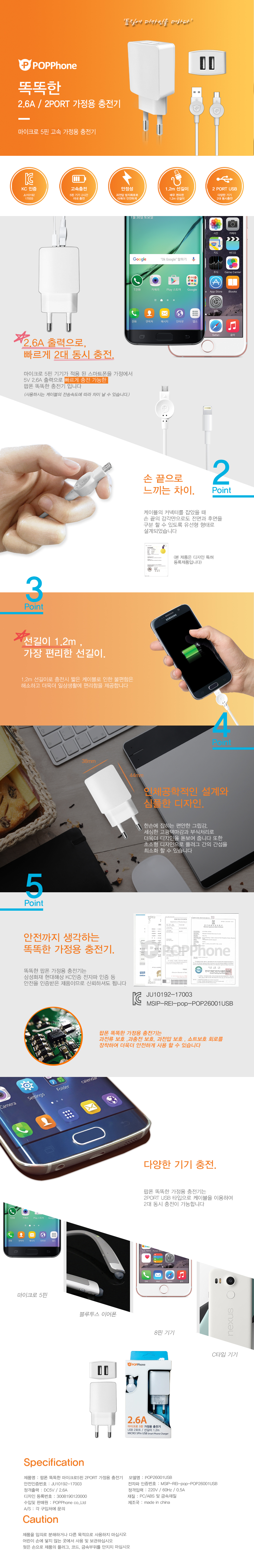 팝폰 TC37 마이크로5핀 분리형 가정용 충전기 (2.6A)