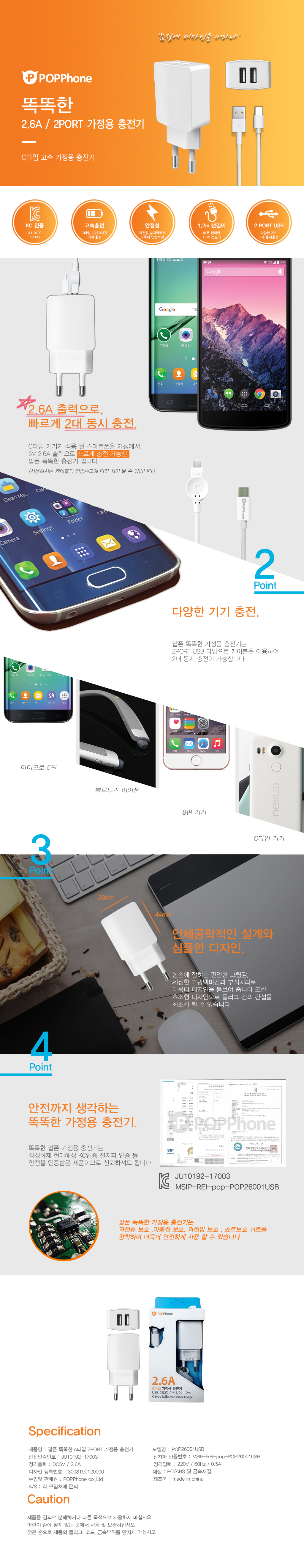 팝폰 TC39 Type-C 분리형 가정용 충전기 (2.6A)