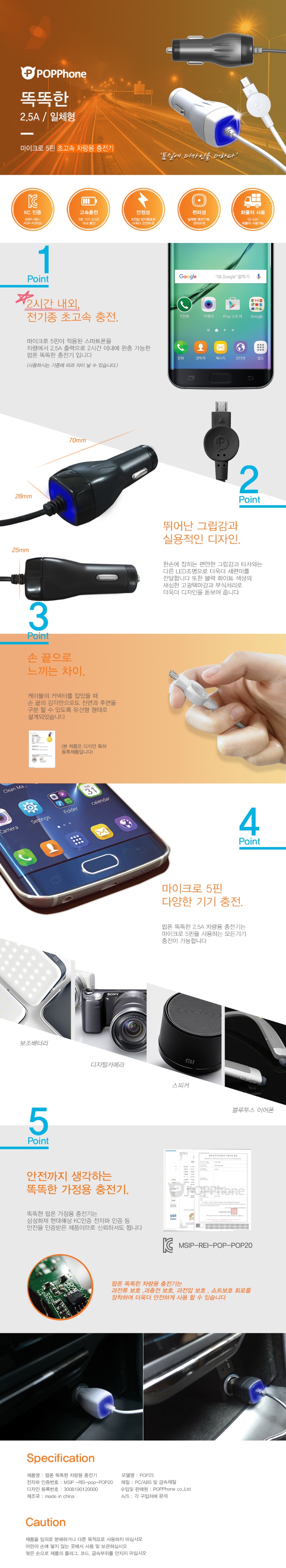 팝폰 CC11 마이크로 5핀 일체형 차량용 충전기 (2.5A)