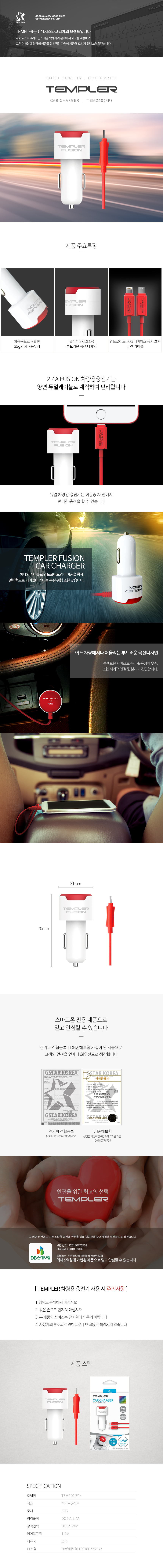 템플러 5핀+8핀 겸용 일체형 차량용 충전기 (2.4A)