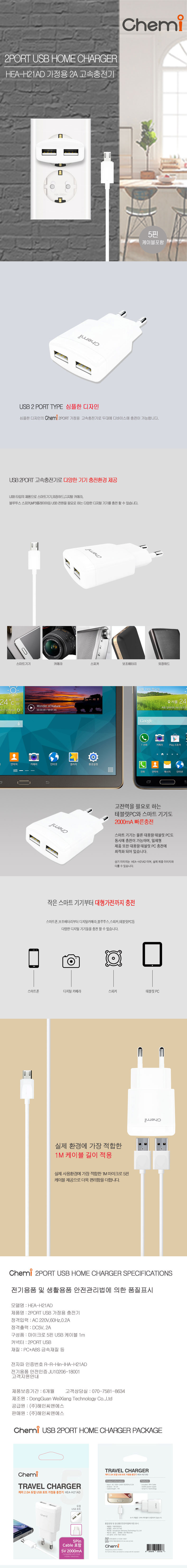 Chemi HEA-H21AD 5핀 USB 2포트 가정용 충전기 (2A)