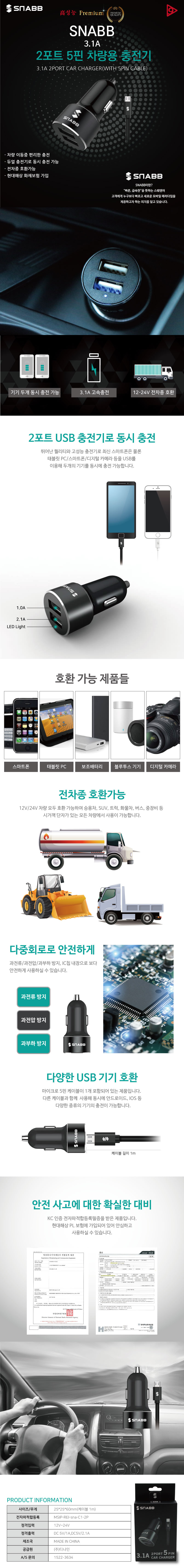 스냅 5핀 USB 2포트 차량용 충전기 3.1A