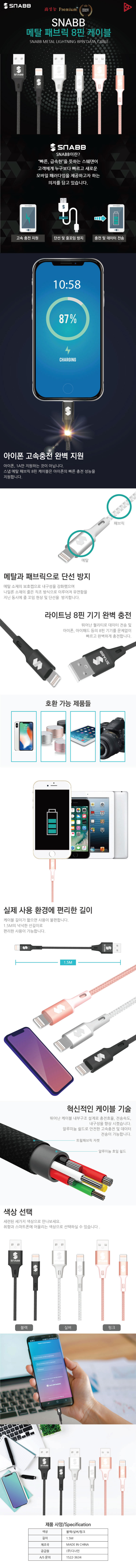 스냅 8핀 메탈 패브릭 충전 데이터 케이블 1.5m