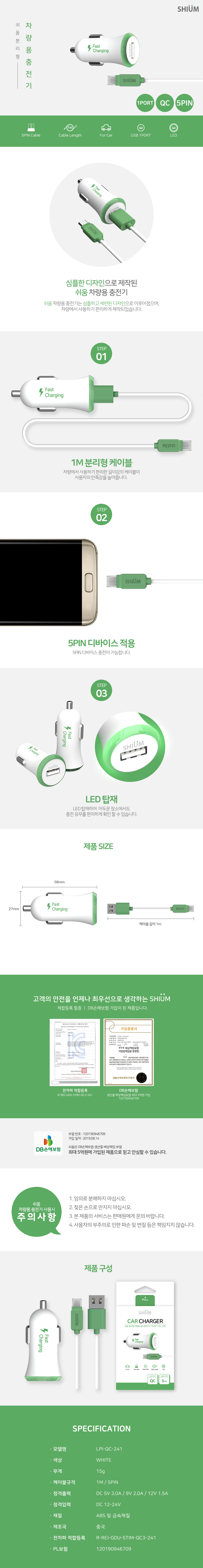 쉬움 5핀 분리형 차량용 급속 충전기 (3.0A)