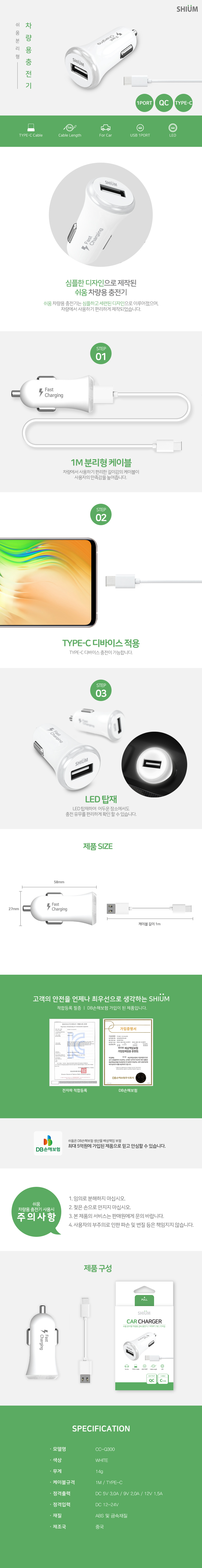 쉬움 C타입 분리형 차량용 급속 충전기 (3.0A)