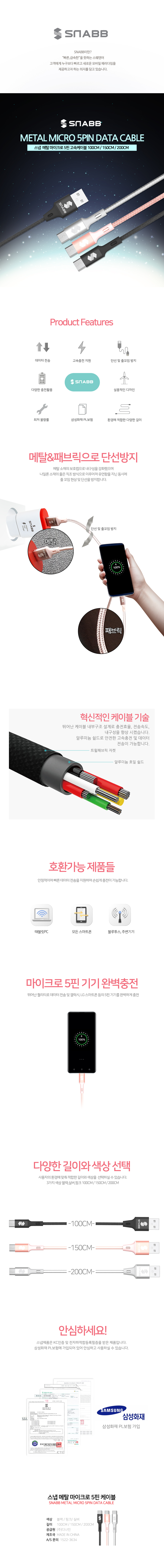 스냅 5핀 메탈 패브릭 충전 데이터 케이블 2m