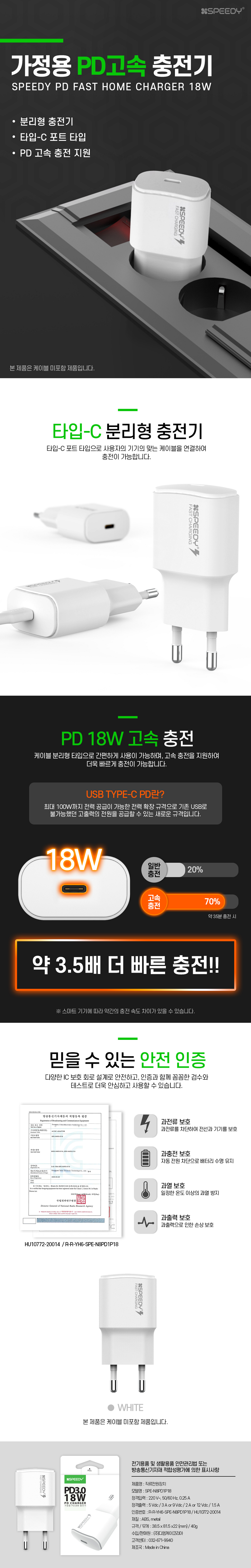 스피디 고속 PD3.0 18W 분리형 가정용 충전기 (C타입 포트) ※5V3A,9V/2A,12V/1.5A※
