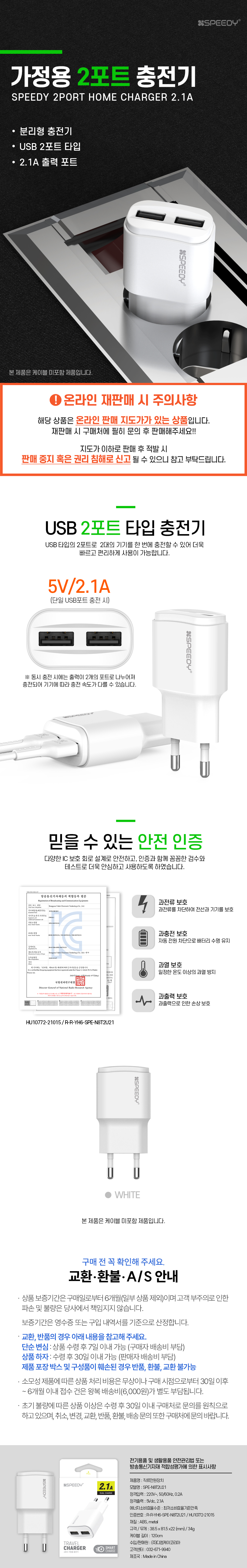 NEW 스피디 USB 2포트 가정용 충전기 (2.1A)