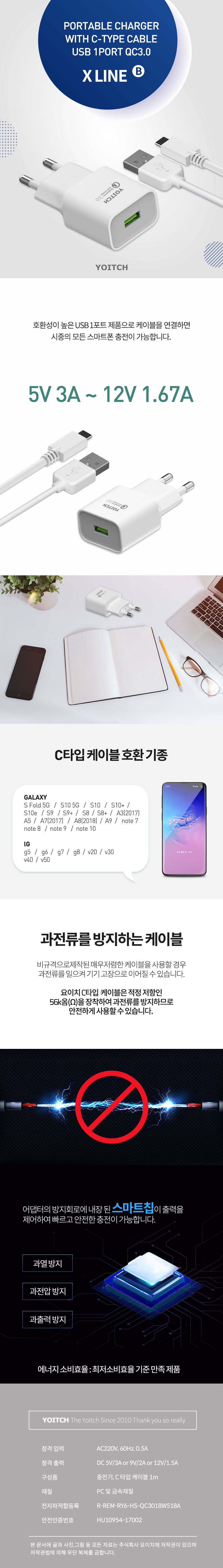 요이치 X라인 QC3.0 C타입 USB 1포트 가정용 충전기