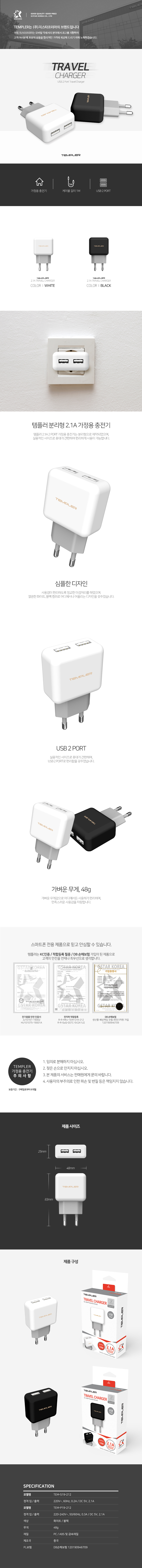 [행사] 템플러 USB 2포트 분리형 가정용 충전기 (2.1A)