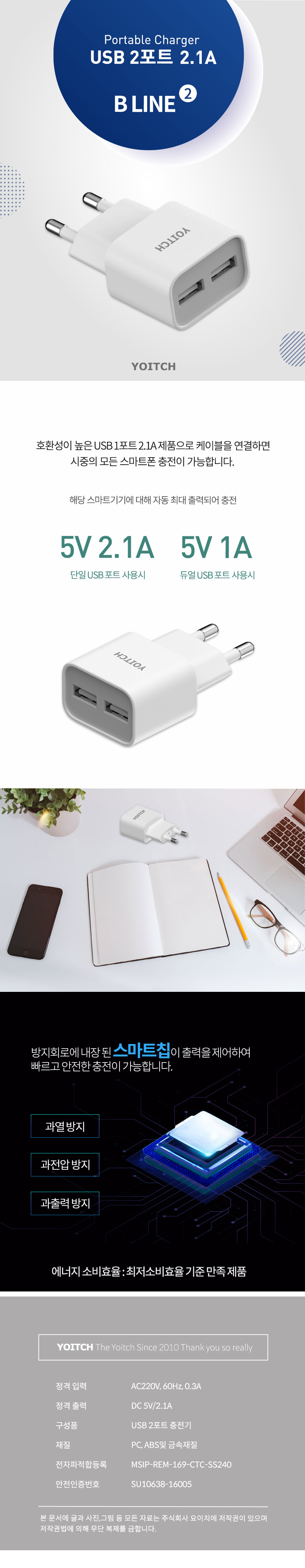 요이치 B라인 USB 2포트 가정용 충전기 (2.1A)