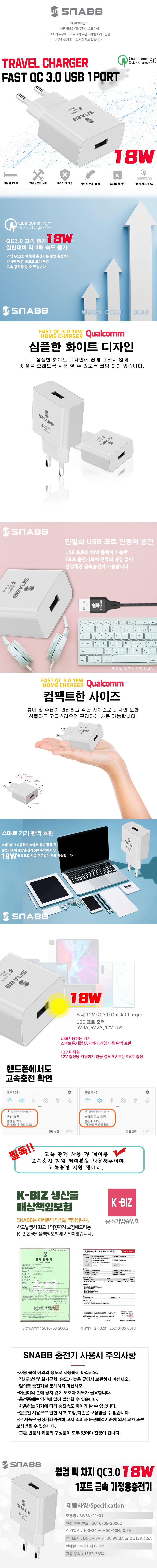 스냅 QC 3.0 18W 1포트 급속 가정용 충전기 (5V 3A / 9V 2A / 12V 1.5A)