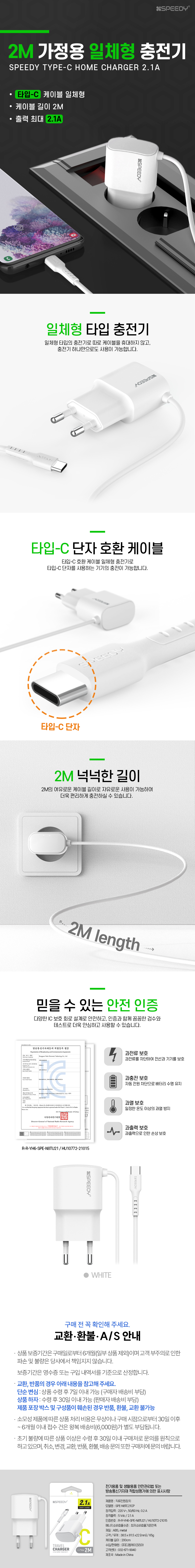 NEW 스피디 C타입 일체형 가정용 충전기 (2.1A) 2M