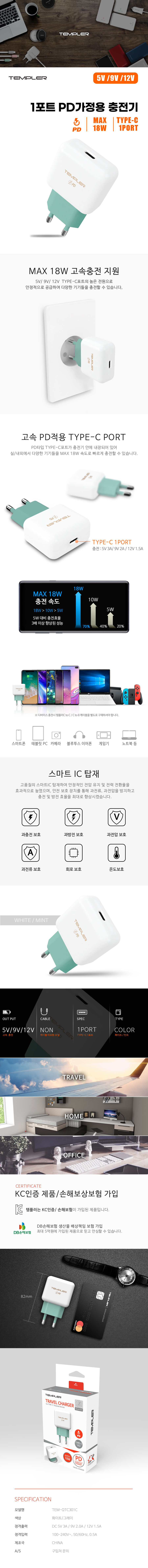 템플러 PD 18W 1포트 고속 가정용 충전기 (C타입 포트)