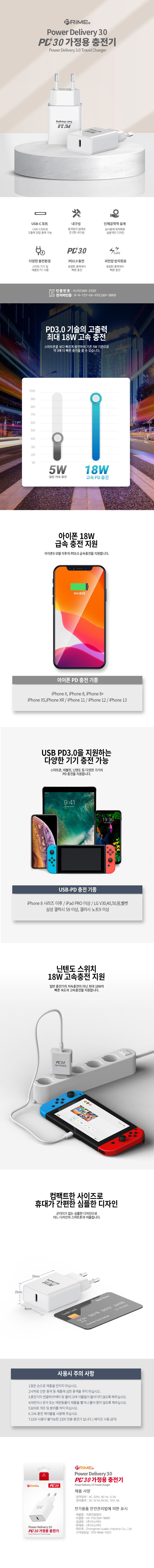프라임 PD3.0 18W 분리형 가정용 충전기 (C타입 포트)