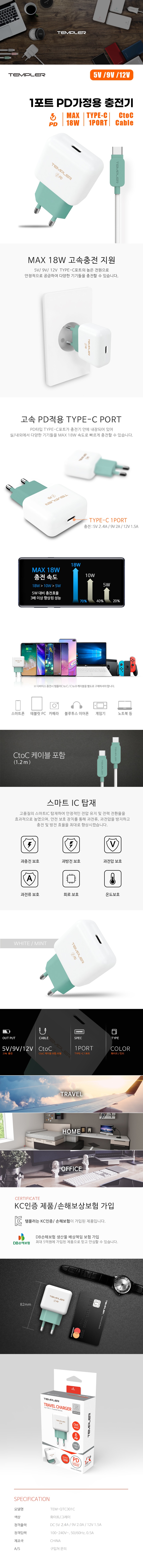템플러 CtoC PD 18W 1포트 고속 가정용 충전기 (C타입 포트)