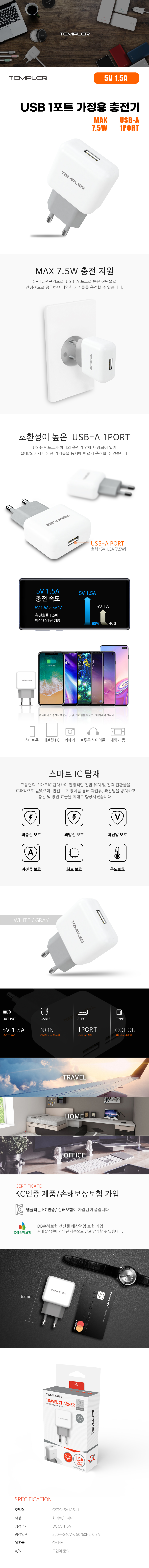 템플러 USB 1포트 분리형 가정용 충전기 (1.5A)