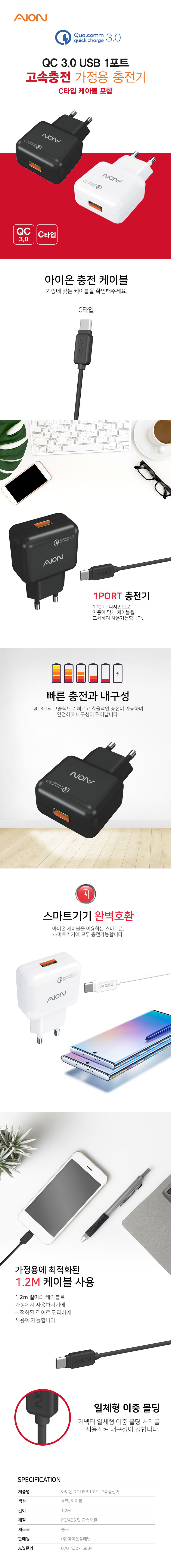 아이온 QC3.0 C타입 USB 1포트 고속충전 가정용 충전기 (5V/3A)