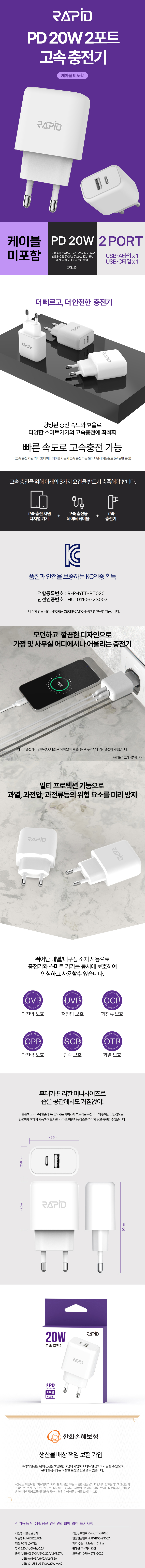 라피드 PD 20W 2포트 고속 가정용 충전기 (USB+C타입 포트)