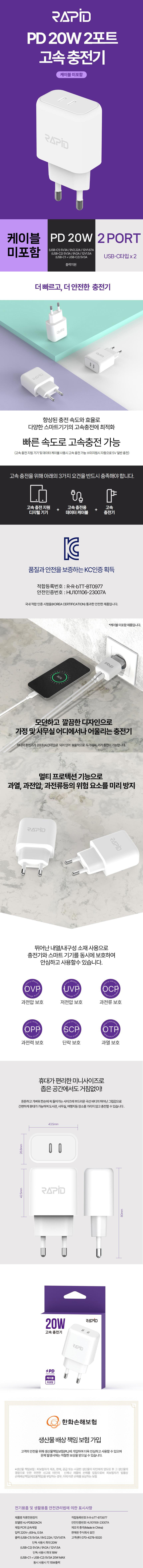 라피드 PD 20W C타입 2포트 고속 가정용 충전기 (C+C)