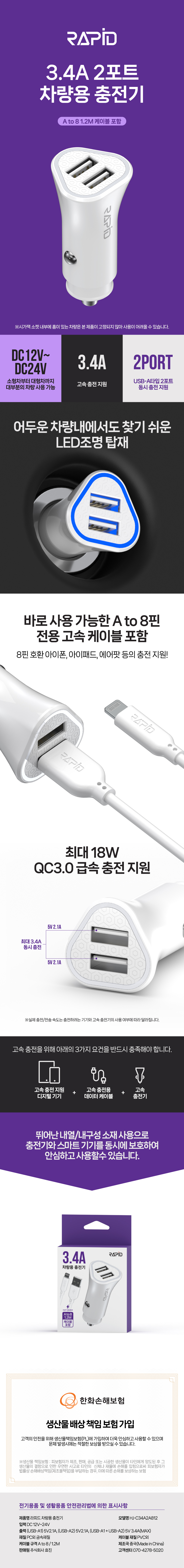 라피드 8핀 USB 2포트 차량용 충전기 (3.4A)