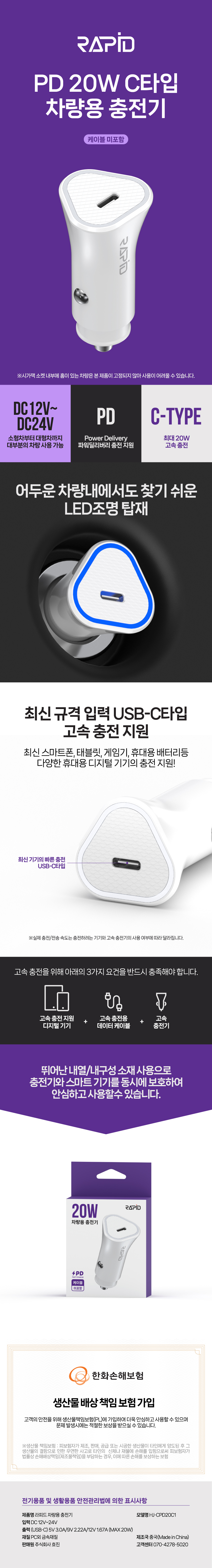 라피드 PD 20W C타입 1포트 고속 차량용 충전기 (5V/3A)
