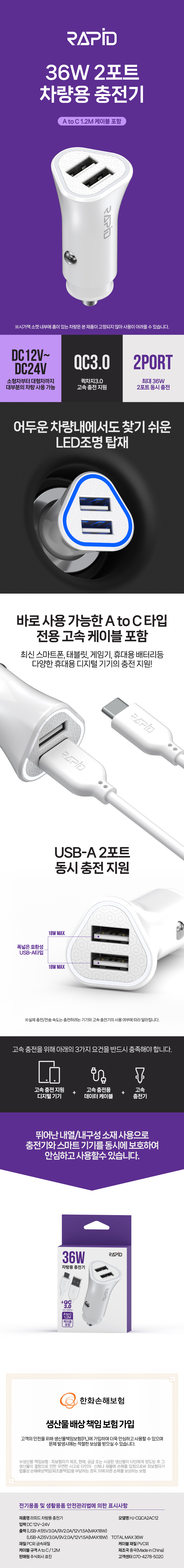 라피드 C타입 36W QC3.0 USB 2포트 차량용 충전기 (5V/3A)