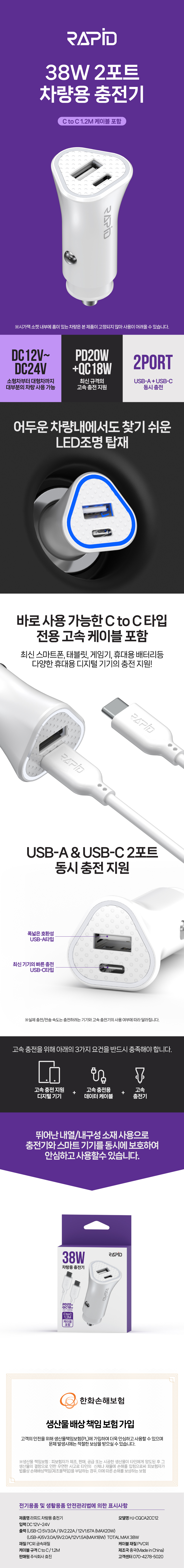 라피드 CtoC 38W(PD20W+QC18W) 2포트 차량용 충전기 (USB+C타입 포트)