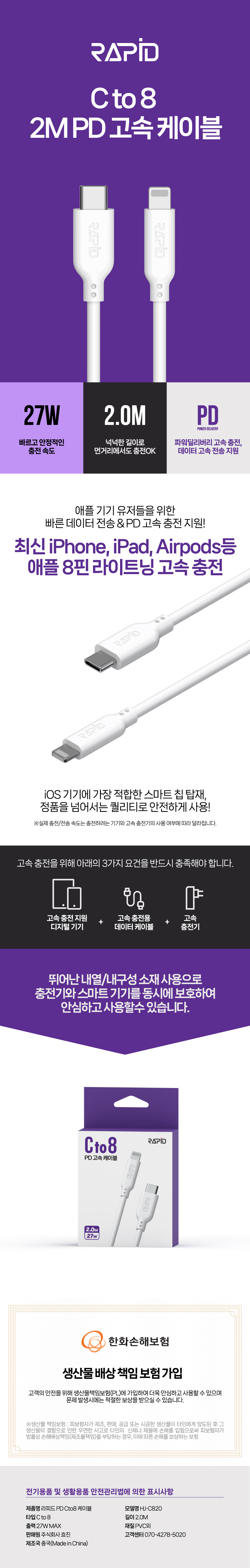 라피드 Cto8 PD 27W 고속 충전 데이터 케이블 (2.0M)