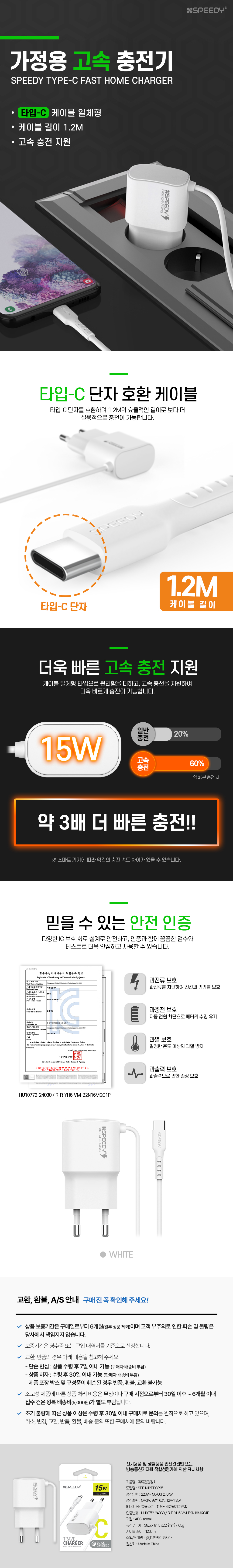 스피디 C타입 15W(QC3.0) 고속 일체형 가정용 충전기 (5V/3A)