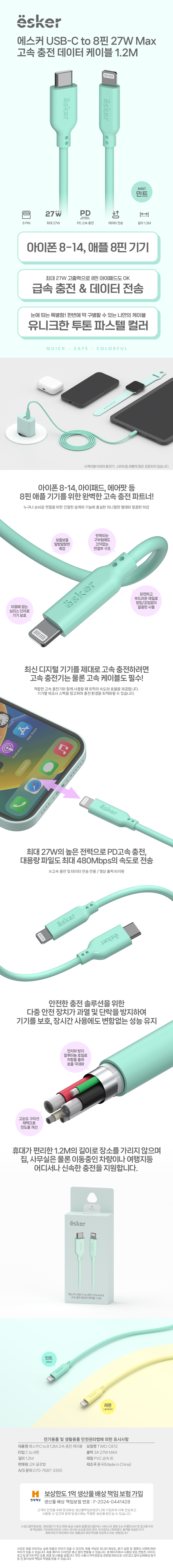 에스커 Cto8 PD 27W 고속 충전 데이터 케이블 (1.2M)