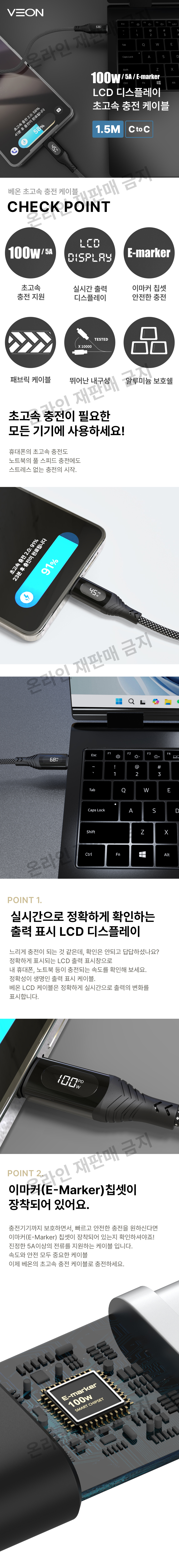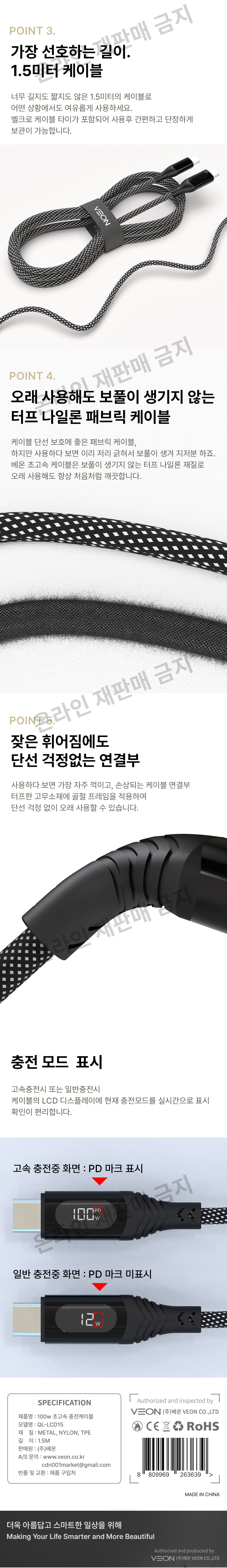 베온 CtoC LCD 디스플레이 100W 초고속 충전 데이터 케이블 1.5M (QL-LCD15)